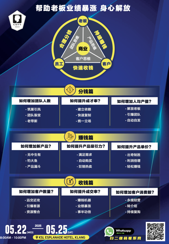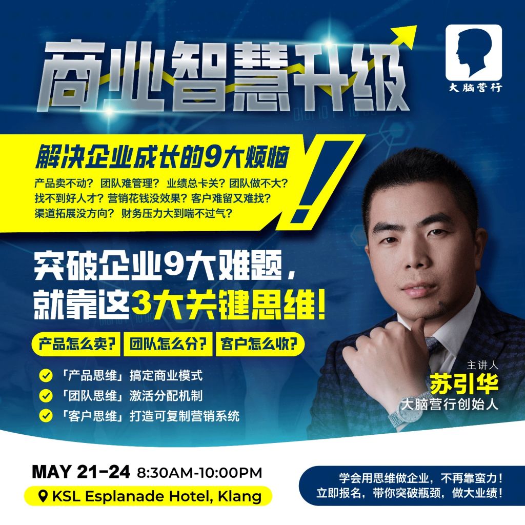 你是否正在面对以下挑战? 产品不好卖,找不到突破口? 团队越来越大,却越来越难管理? 销售业绩停滞不前,怎么推都动不了? 优秀人才留不住,新人一来就走? 营销预算越花越多,效果却越来越差? 客户越来越难找,成交越来越难? 财务压力接踵而来,现金流吃紧? 渠道难拓展,合作机会越来越少? 团队始终做不大,没有规模化? 这些问题,不是你一个人在面对, 而是90%的企业都在卡在同样的成长瓶颈里! 为什么你很努力,却依然没结果? 不是你不够拼,而是思维出了问题!🔓 你需要的不是更多的方法,而是一套看得见全局的「商业思维系统」! 📌 主讲内容 — 系统化破解企业成长难题 讲师:苏引华 大脑营行 创始人,实战型导师企业增长思维实战导师10+年辅导上千家企业破局成长的实战经验👉 学会用「产品思维」搞定商业模式 👉 用「团队思维」激活分配机制 👉 用「客户思维」打造可复制营销系统突破企业9大难题,就靠这3大关键思维!🔸 产品怎么卖? 🔸 团队怎么分? 🔸 客户怎么收? 🔥 三大关键思维,带你打通商业任督二脉: 💡 产品思维:让产品自己会赚钱!不是卖得多,而是卖得对!方法对了,营销才有效,再也不用苦苦推销找到对的市场与渠道,生意才能快速放大清楚知道「卖什么、怎么卖、卖给谁」告别价格战、库存堆积、销量焦虑!💼 团队思维:打造能冲业绩的铁军!分钱机制不清,员工怎么会拼?有考核、有晋升、有方向,团队自然有动力不是靠人情留人,而是靠制度+愿景聚人管理要从“人盯人”变“制度跑”,老板才能轻松有规则、有系统,团队才能真正做大!🤝 客户思维:让每一单都能标准化复制!别再靠能人撑业绩,靠的是流程+系统+团队复制打造人人能成交的销售机制告别单打独斗,让成交成为流程,而不是靠运气客户从陌生到成交,有章法、有脚本、有节奏稳定收钱 = 稳定成长! 🧠 学会用“思维”做企业,不再靠“蛮力”硬扛! 企业做不大,不是资源不够、不是人不行,而是缺一套能落地、能复制、能升级的商业思维系统!日期:21/5- 24/5 (星期三-星期六)时间:8.30AM-10.00PM地点: KSL Esplanade Hotel, Klang 📢 现在报名,你将收获:✅ 一套系统化的商业增长模型✅ 解决企业9大核心问题的实战框架✅ 从老板独撑,到团队协作高效执行✅ 企业从混乱、低效走向有序、倍增! Please enable JavaScript in your browser to complete this form.Please enable JavaScript in your browser to complete this form.名字 *公司名字WhatsApp号码 * 名字 WhatsApp号码 公司名字 电邮 *立即报名 💥 现在就行动!机会只留给有准备的企业家!点击下方按钮,立即预约课程席位👇🎯【立即报名】🔒 名额有限,先到先得!